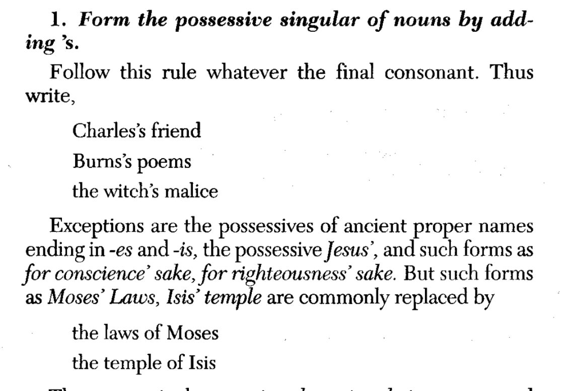 Whatever one thinks of this issue, Strunk and White’s position can perhaps be accepted. What must be questioned, though, is the exception they make for “ancient proper names” like Jesus and Moses. I mean — really? On what grounds? On whose authority? When students encounter this seemingly baffling exception, they often throw their book across the room.